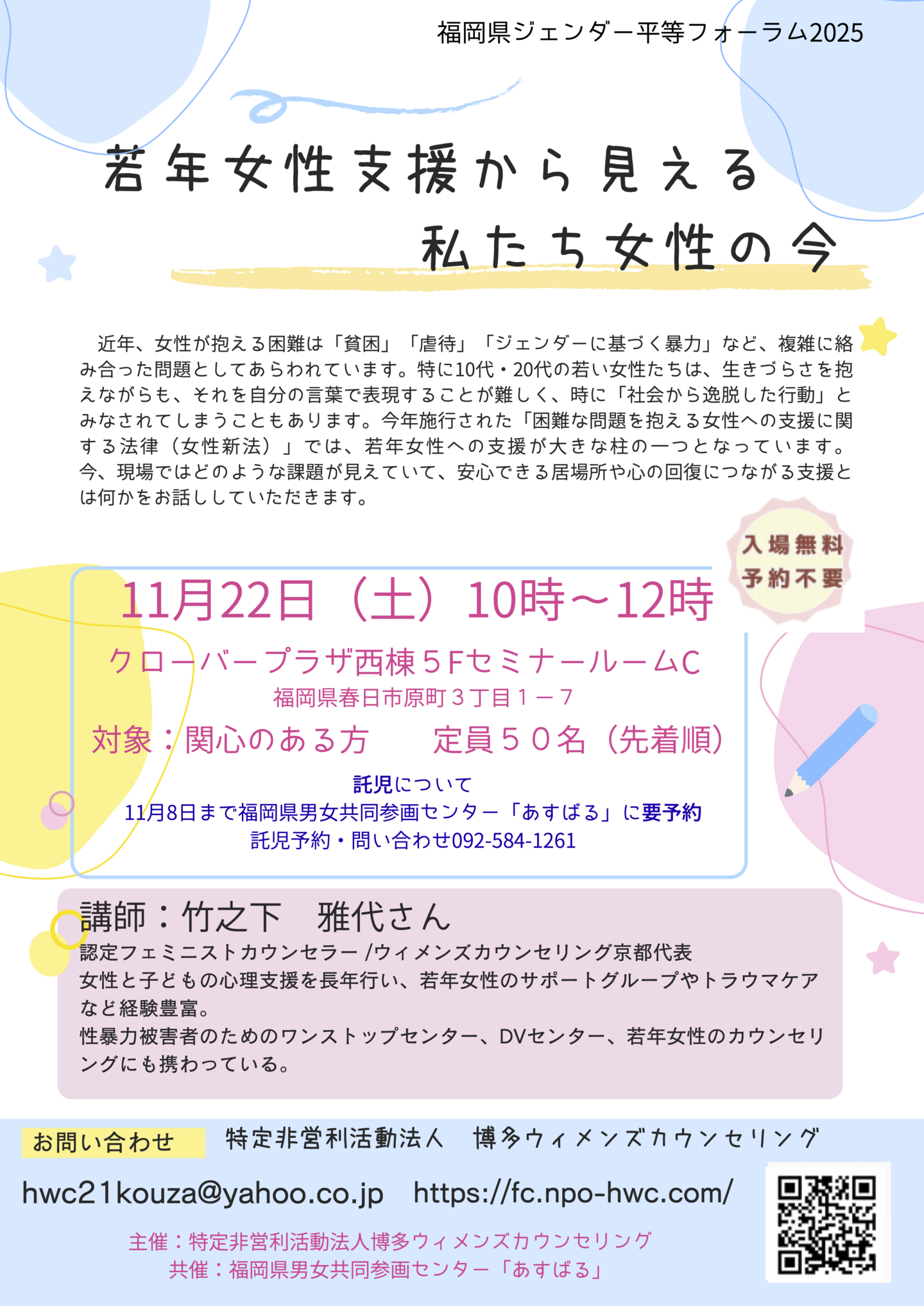 託 児:ご利用の方は11/8までに「あすばる」へお問い合わせください(TEL:092-584-1261)