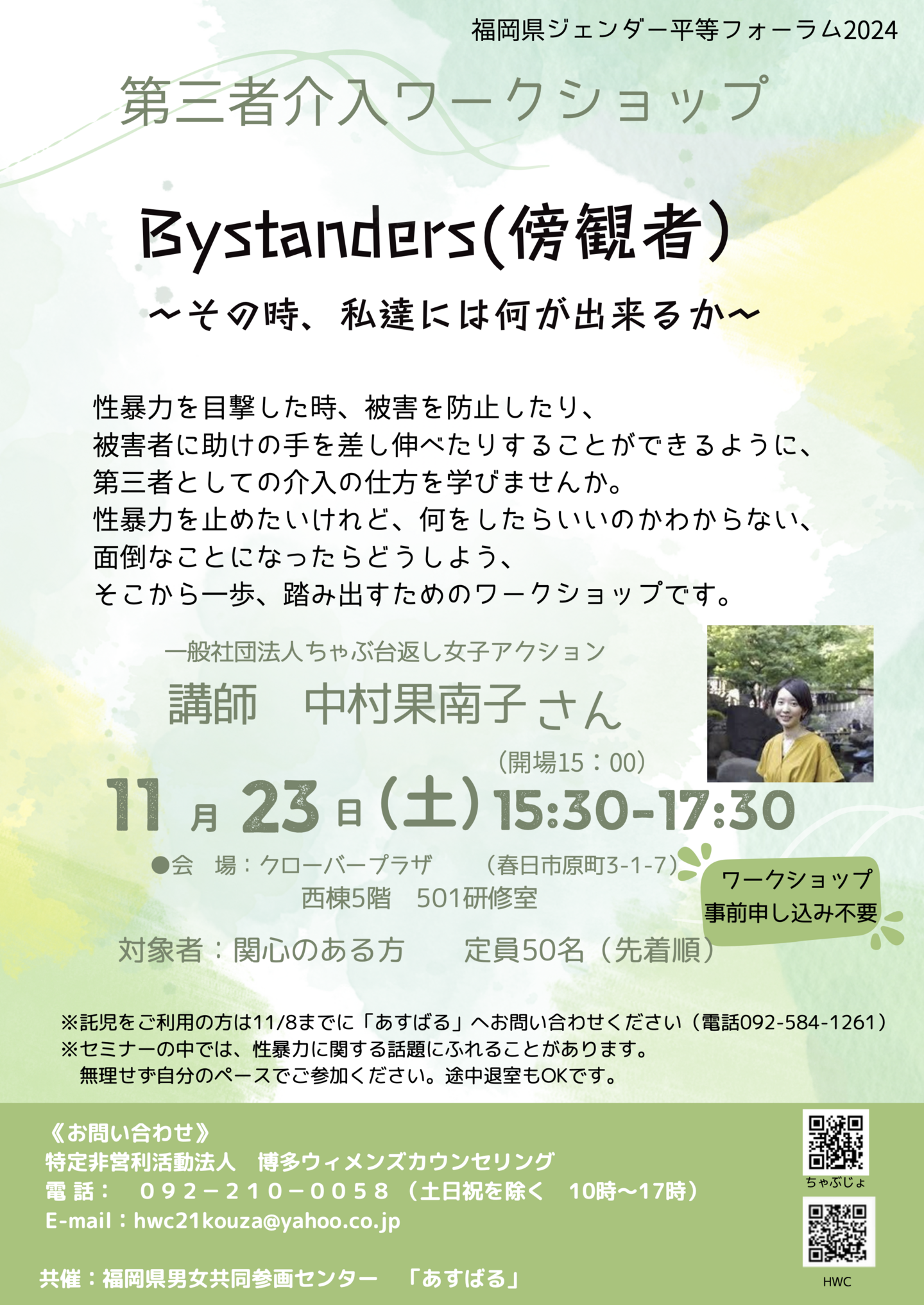 性暴力を止めたいけれど、何をしたらいいのかわからない、面倒なことになったらどうしよう、そこから一歩、踏み出すためのワークショップです。